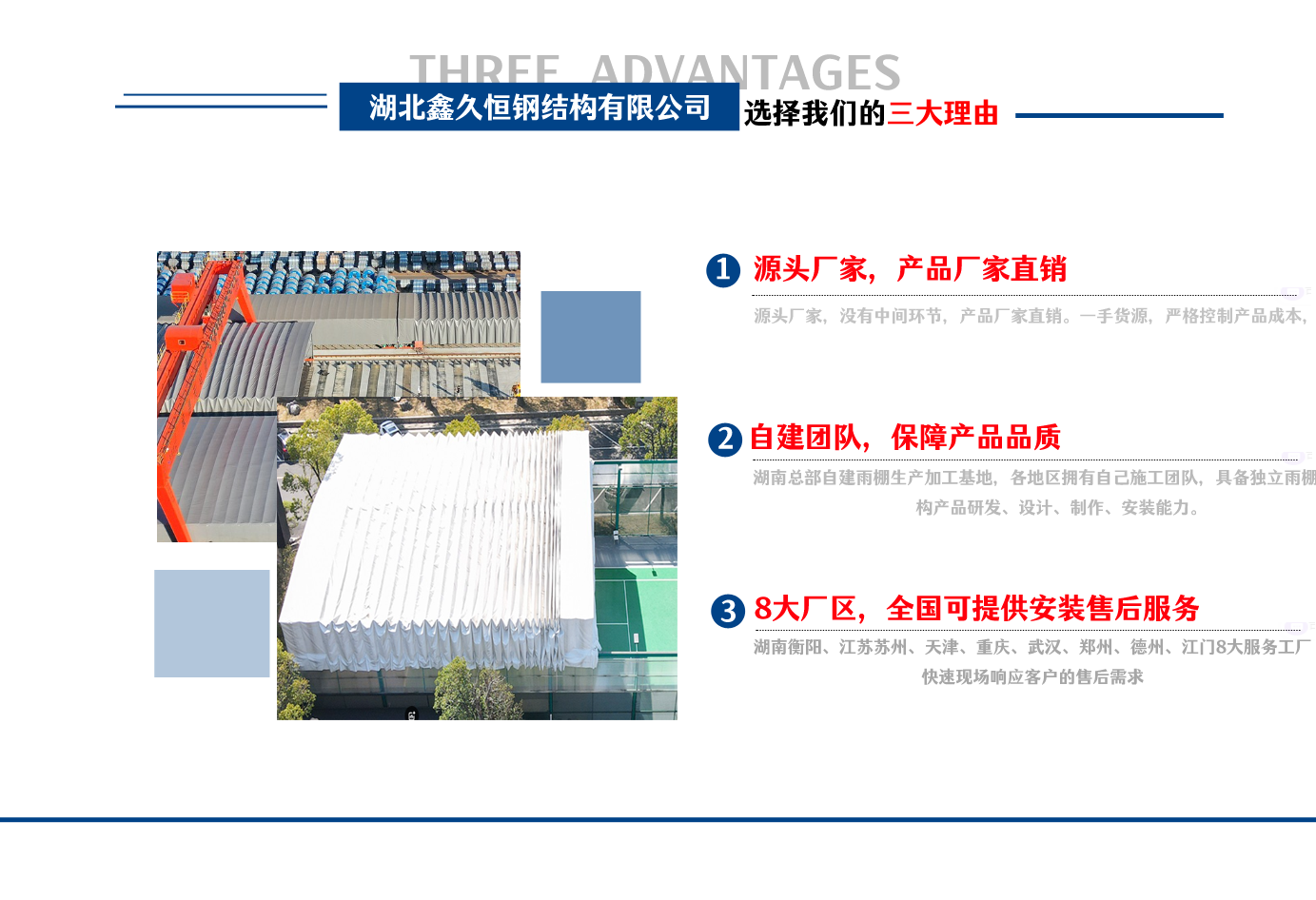 湖北鑫久恒鋼結構有限公司是一家電動雨棚、膜結構車棚研發,生產銷售,施工安裝于一體的專業鋼結構科技公司,主要產品有伸縮雨棚,電動雨棚,膜結構車棚等。  湖南地區職員目前有80多人,占地面積20000平方米,廠房面積15600平方米,配備先進的生產流水線,使每件品質產品的堅實基礎?! 」驹谔K州、天津、重慶、武漢、德州、烏魯木齊、江門均設有服務工廠,總人員共300多人,擁有專業的技術團隊,配備先進的設備和流水線生產,產能高,貨源充足,發貨速度快,服務區域廣。  移動伸縮棚適用于通道臨時倉儲、戶外運動遮陽、污水池遮蓋、能源交通、熱力化工、礦山、船舶制造及市政建設、物流、碼頭等領域的構件制作加工,成品半成品存放、倉庫、野外儀器設備操作用房等。尤其是對工廠發貨、倉儲臨時遮雨防嗮,梅雨期較長、建設周期較短的工程施工等特別適用。還可根據用戶需求量身定制、適合企業所需不同款式的產品。  我公司堅持“誠信社會為本,客戶滿意為榮”的經營理念,做到質量把控,嚴格管理,精益求精,恪守承諾。使鑫久恒逐步走向成熟,其系統化、專業化日趨完善。以專業的技術、科學的管理,更高的產品質量,優良的企業信譽,真誠的客戶服務,靈活多樣的經營方式和務實創新的企業精神愿與社會各界攜手合作,為推動智能鋼結構建筑事業的發展而不斷努力。...